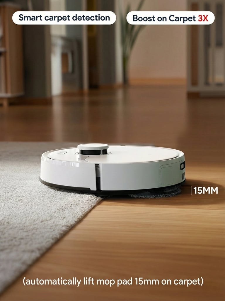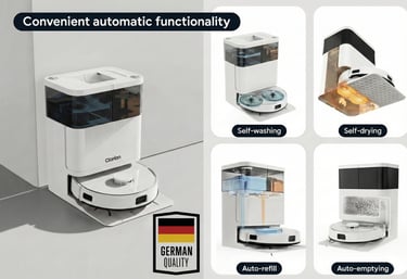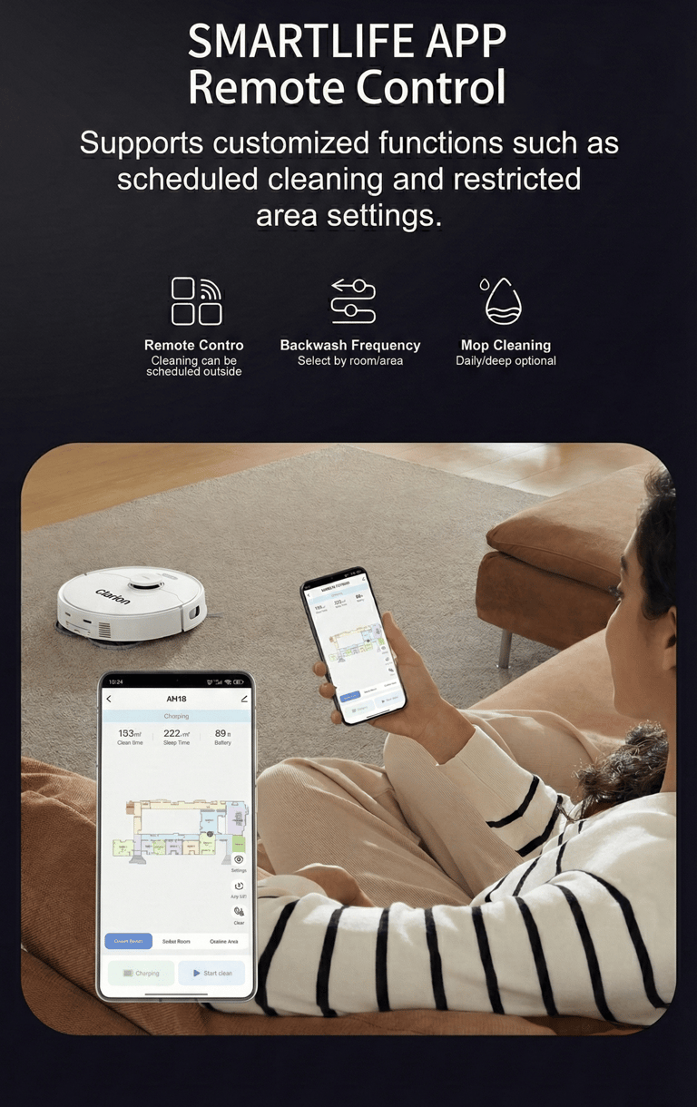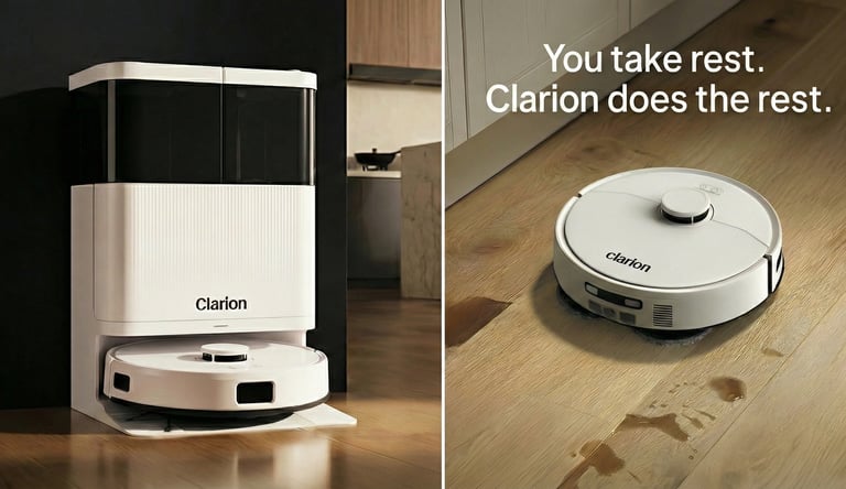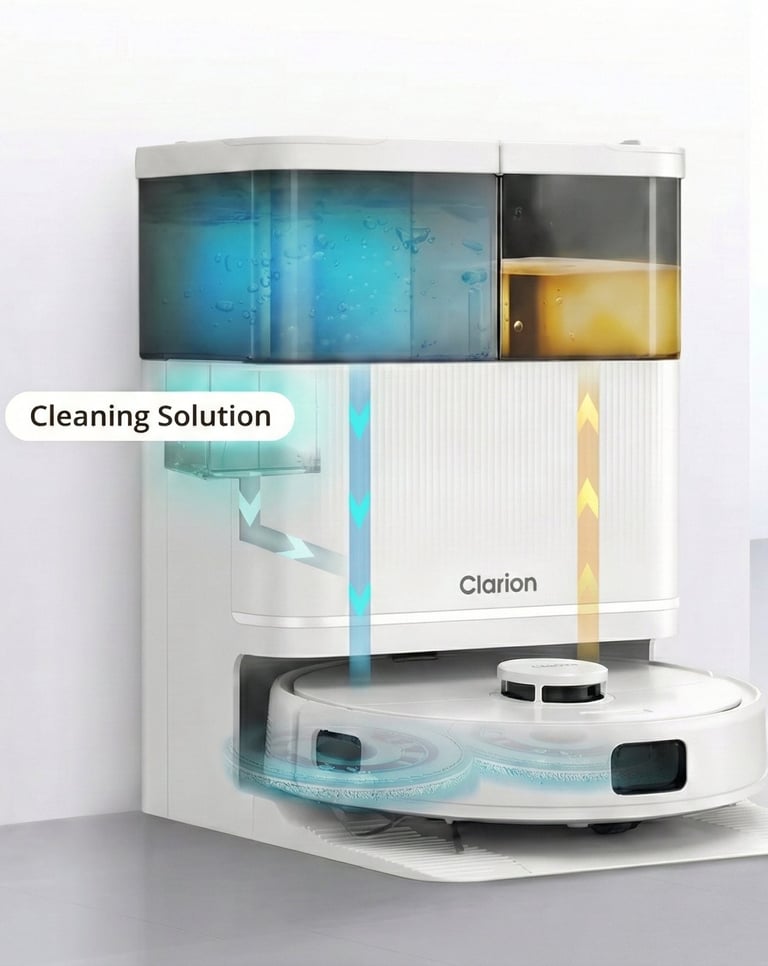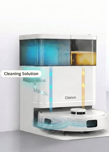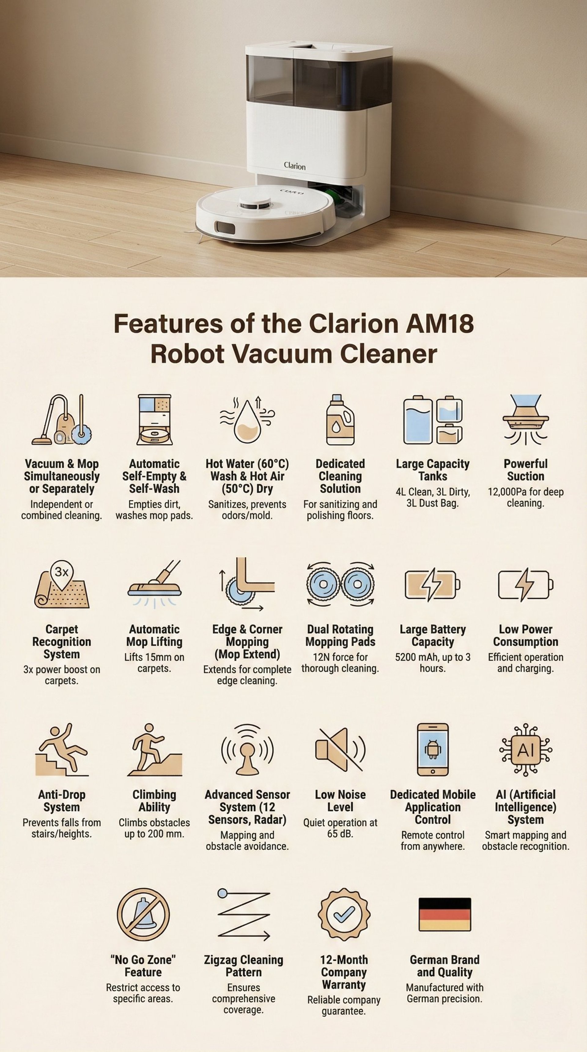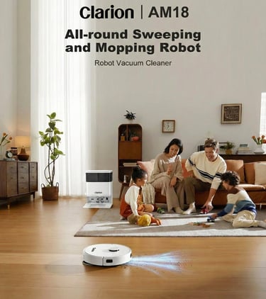 Clarion AM18 is a premium all‑in‑one robot vacuum and mop system with a fully automatic base station. It vacuums, mops, washes itself, dries itself, and empties dust automatically – delivering a truly effortless cleaning experience for modern homes.