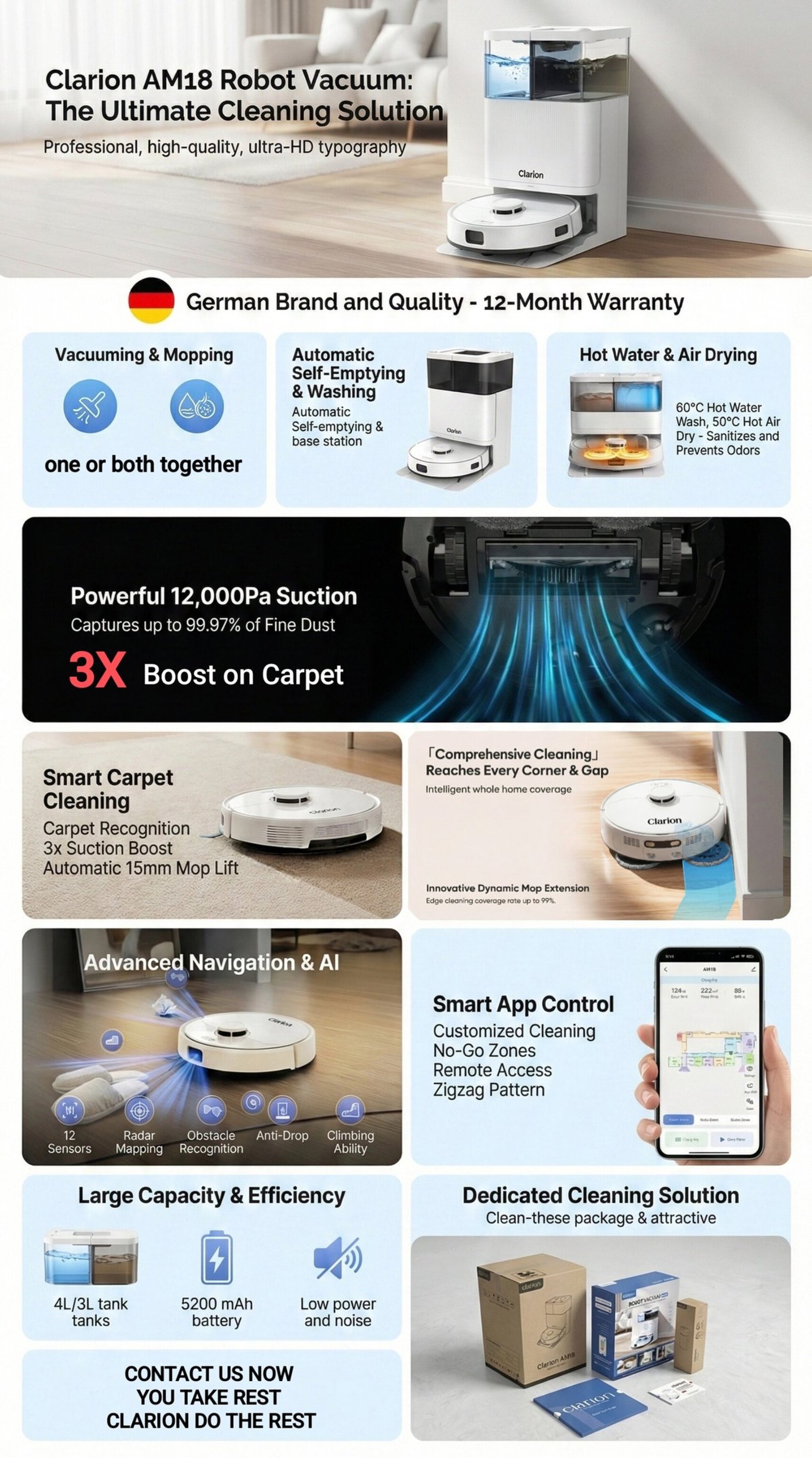 Clarion represents the German engineering technology , combining craftsmanship with innovative technology. Every AM18 robot vacuum cleaner embodies our commitment to precision, quality, and performance that exceeds expectations.